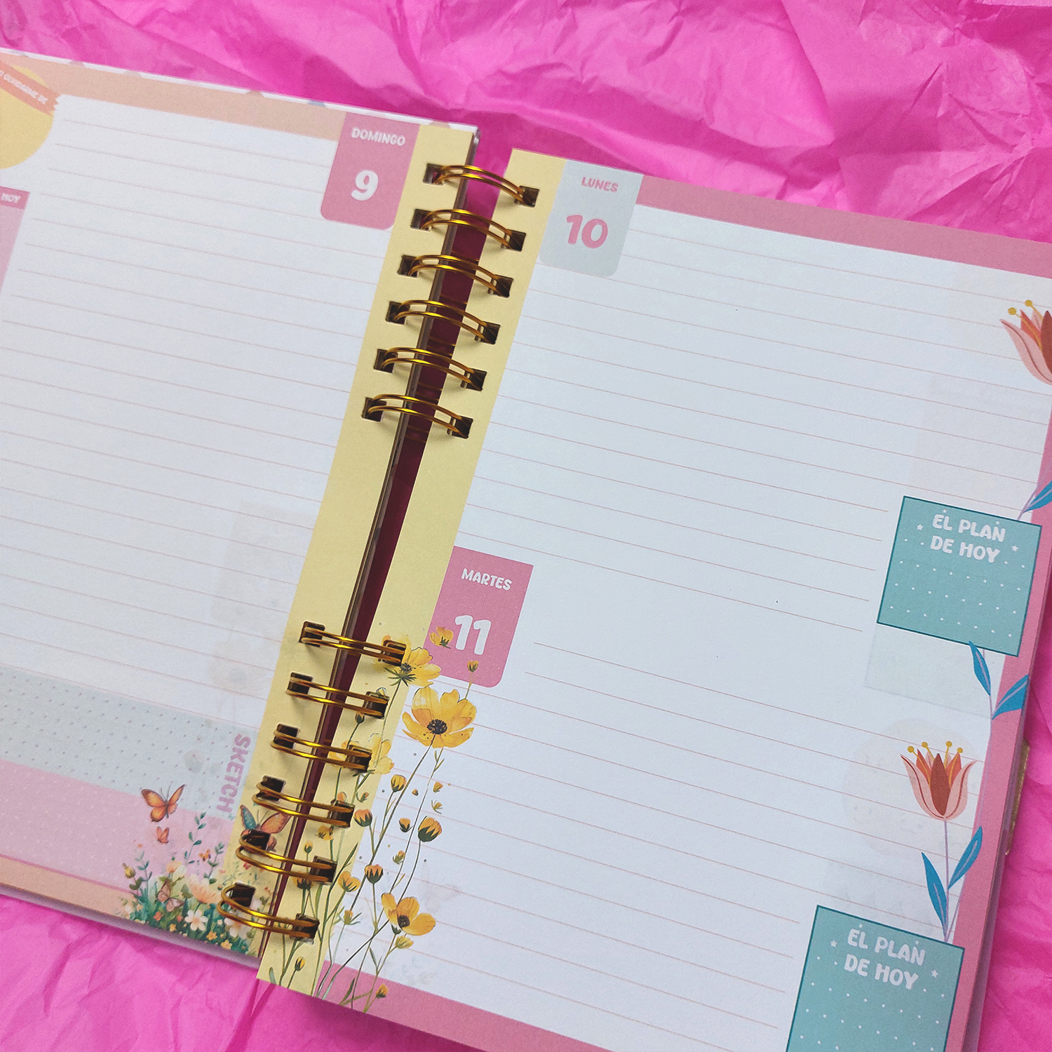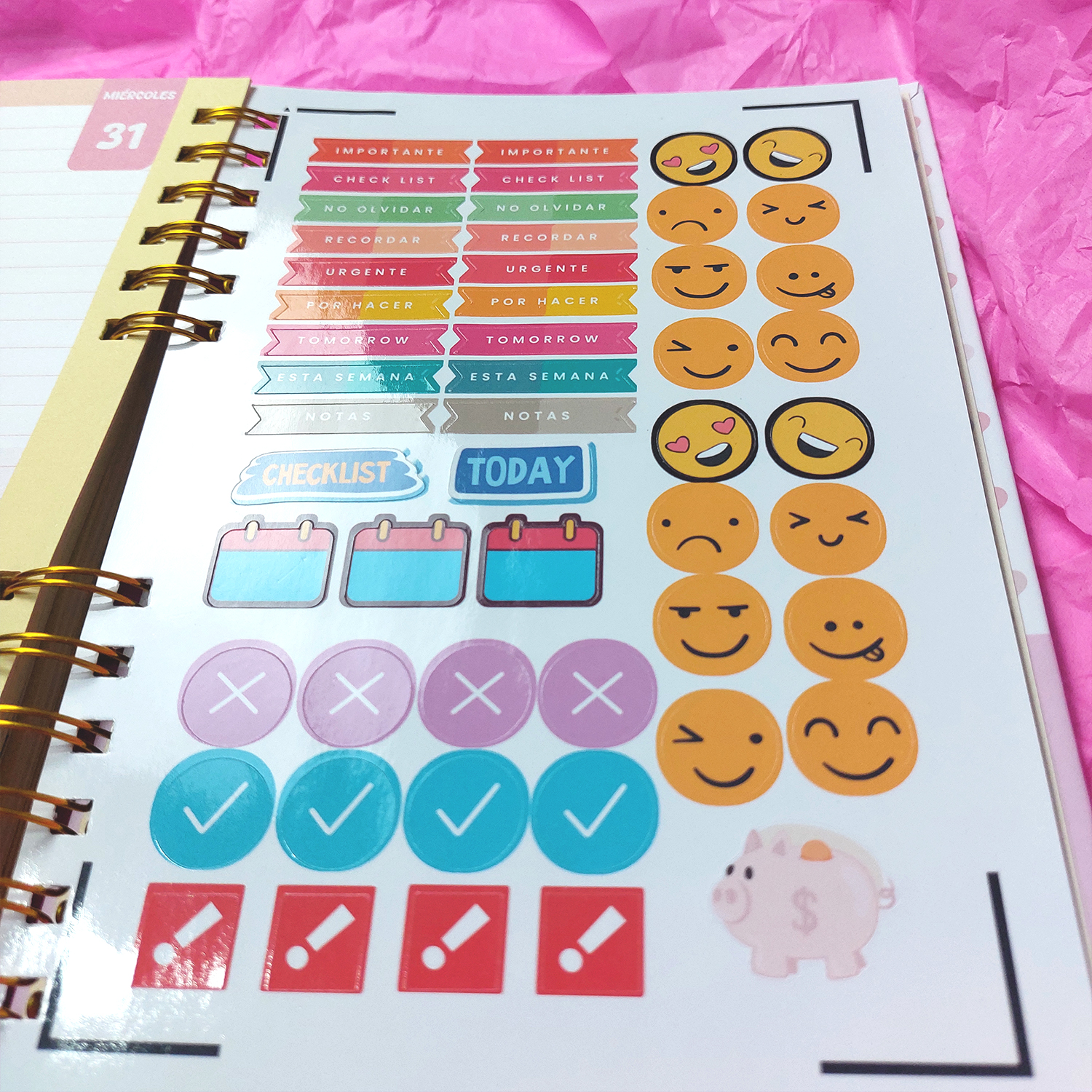 Portada y Contraportada detalles en foil sectorizado, hoja de Datos Personales, hojas agenda diaria personalizadas con temática, planificador mensual, separador por meses, sobre carpeta en la contratapa, 2 hojas stickers, pasacinta (verificar diseño según stock) y cinta elástica (verificar color según stock)