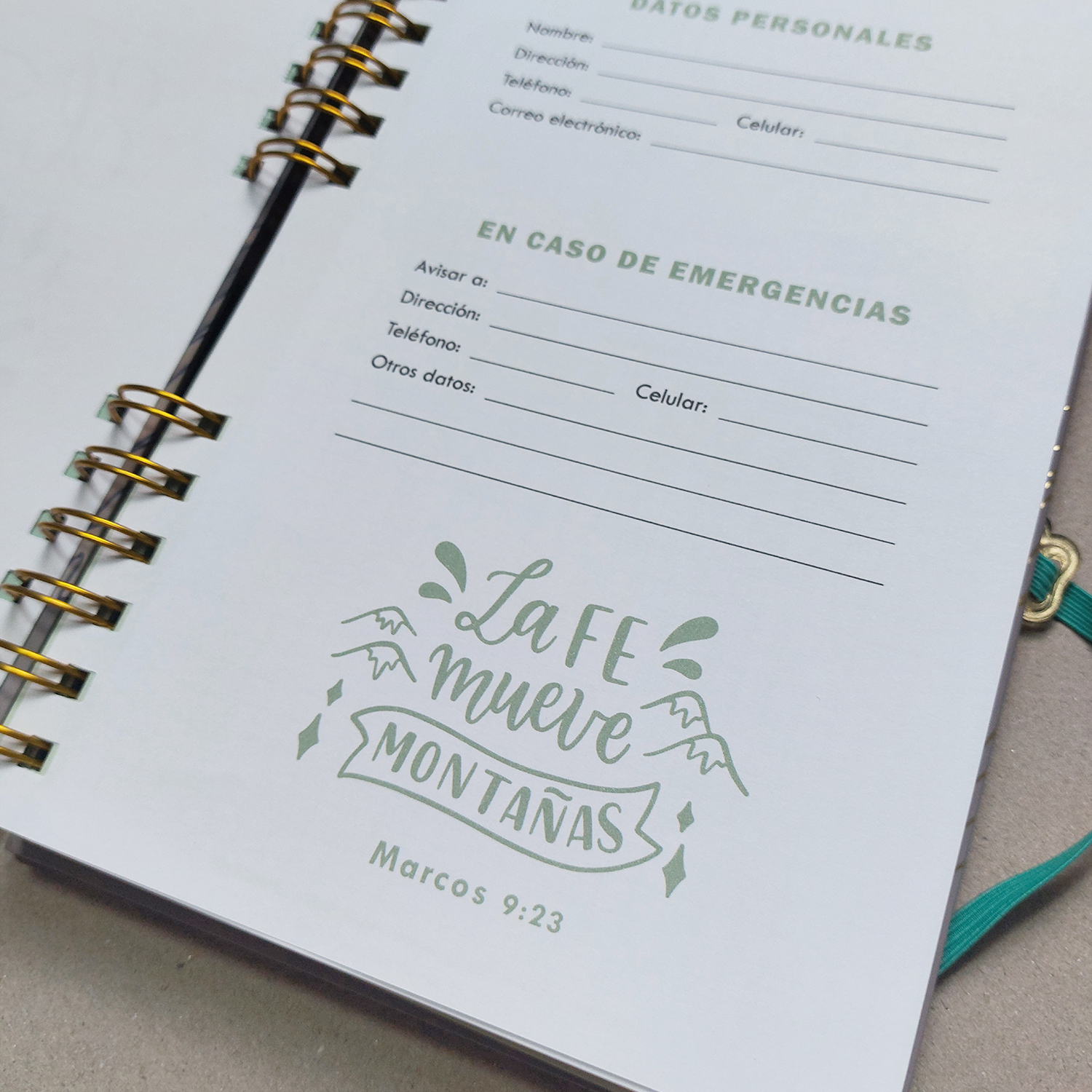 Portada y Contraportada detalles en foil sectorizado, hoja de Datos Personales, 90 hojas personalizadas con temática (versículos y frases intercaldas), 10 hojas de un solo color, 3 separadores, sobre carpeta en la contratapa, hojas stickers, pasacinta (verificar diseño según stock) y cinta elástica (verificar color según stock)