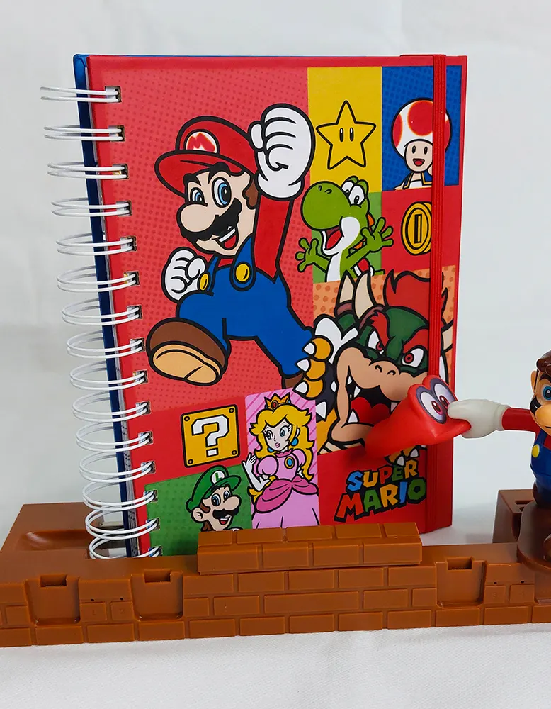 Cuaderno tamaño A5 ‘Super Mario’ espiral doble anillo completo (verificar color según stock), pasta dura laminado mate de 100 hojas tipo journal personalizadas con temática, hoja sobre al inicio, hoja stickers y cinta elástica (verificar color según stock)