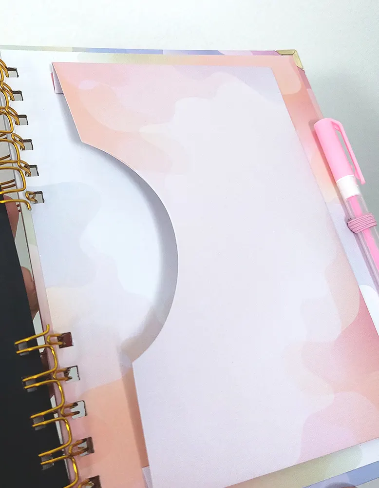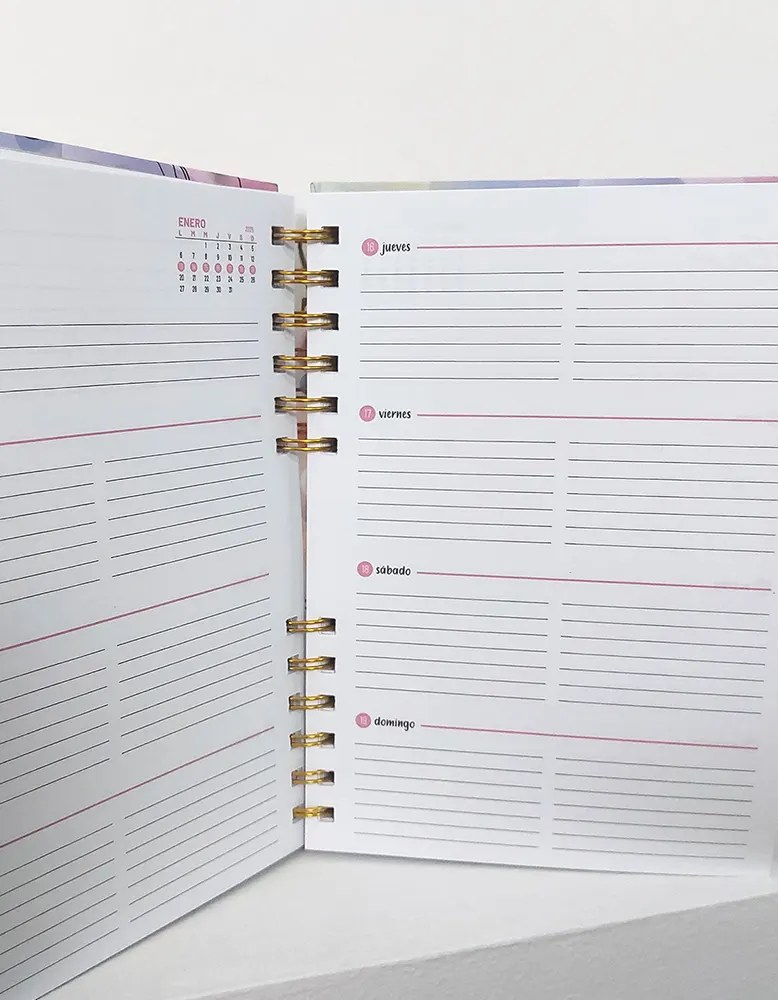 Portada detalles en foil sectorizado, calendario al año, planner agenda diaria personalizadas con temática, 10 hojas de notas, sobre carpeta en la contratapa, hoja stickers, hoja Post-it (verificar diseño según stock), pasacinta (verificar diseño según stock) y cinta elástica (verificar color según stock)